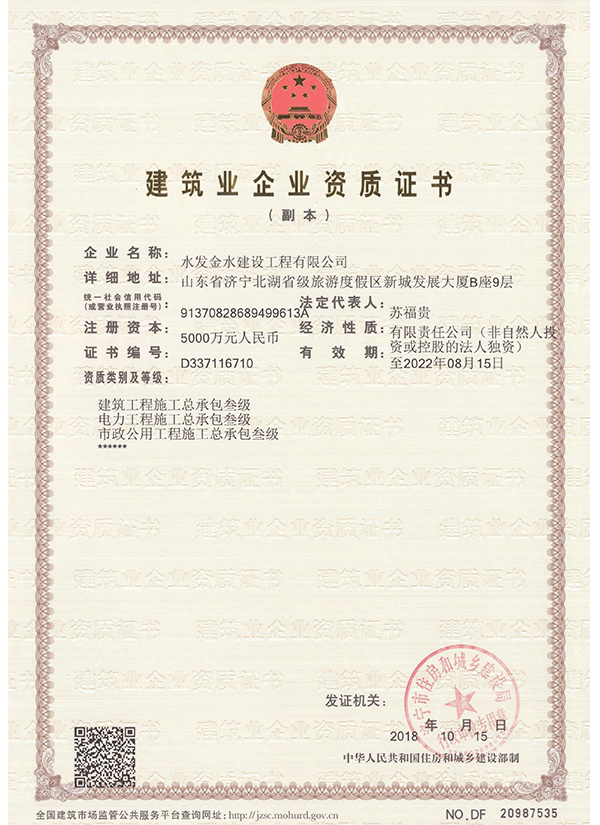 水發金水建設工程有限公司 建筑、電力、市政資質證書